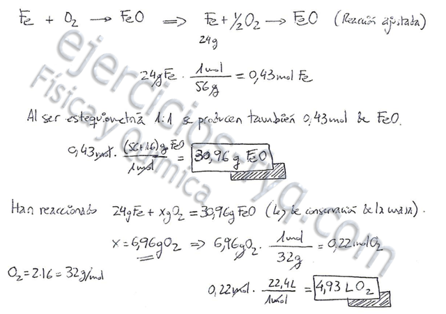 Se hacen reaccionar 24 g de Fe y oxígeno en exceso para dar monóxido de hierro (FeO). ¿Qué cantidad del óxido obtendremos? ¿Qué volumen de