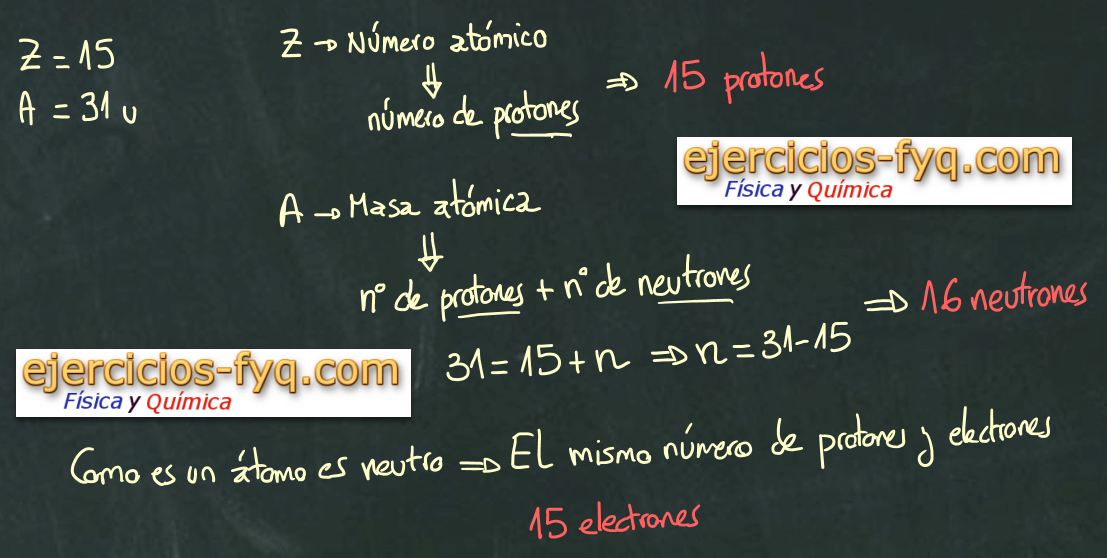 Sabiendo que un átomo tiene un número atómico de 15 y una masa atómica de 31 u, ¿cuántos protones, neutrones y electrones tiene ese átomo?