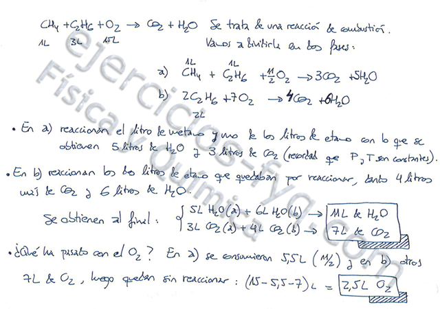 Se tiene una mezcla gaseosa formada por 1 litro de metano, 3 litros de etano y 15 litros de oxígeno. Una vez que los gases han reaccionado, calcula el volumen final de las sustancias existentes en el interior del recipiente si todos ellos están medidos en las mismas condiciones de presión y temperatura, (el agua que se forma se considera en estado gaseoso).