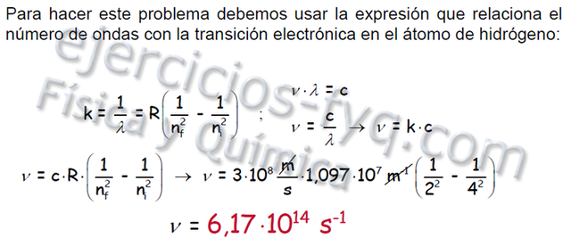 Determina la frecuencia de la radiación emitida por un átomo de hidrógeno cuando un electrón transita desde la cuarta capa hasta la segunda.