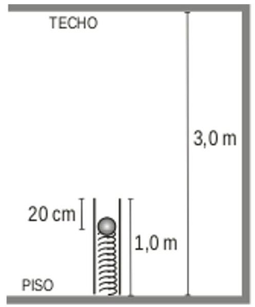 b) Determina, de forma fundamentada, y explica si el cuerpo llega a pegar en el techo que está a una altura de 3 m desde el suelo en el que apoya el resorte de un 1 m de longitud cuando está en reposo.