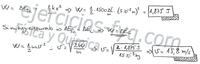 ¿Qué trabajo hemos de hacer para comprimir 5 cm un muelle que tiene una constante de recuperación de 1 500 N/m? Si colocamos una canica de 15 g en la posición de equilibrio del muelle y soltamos este, ¿qué velocidad adquiere la canica en el momento del impacto? Desprecia todo tipo de rozamiento.