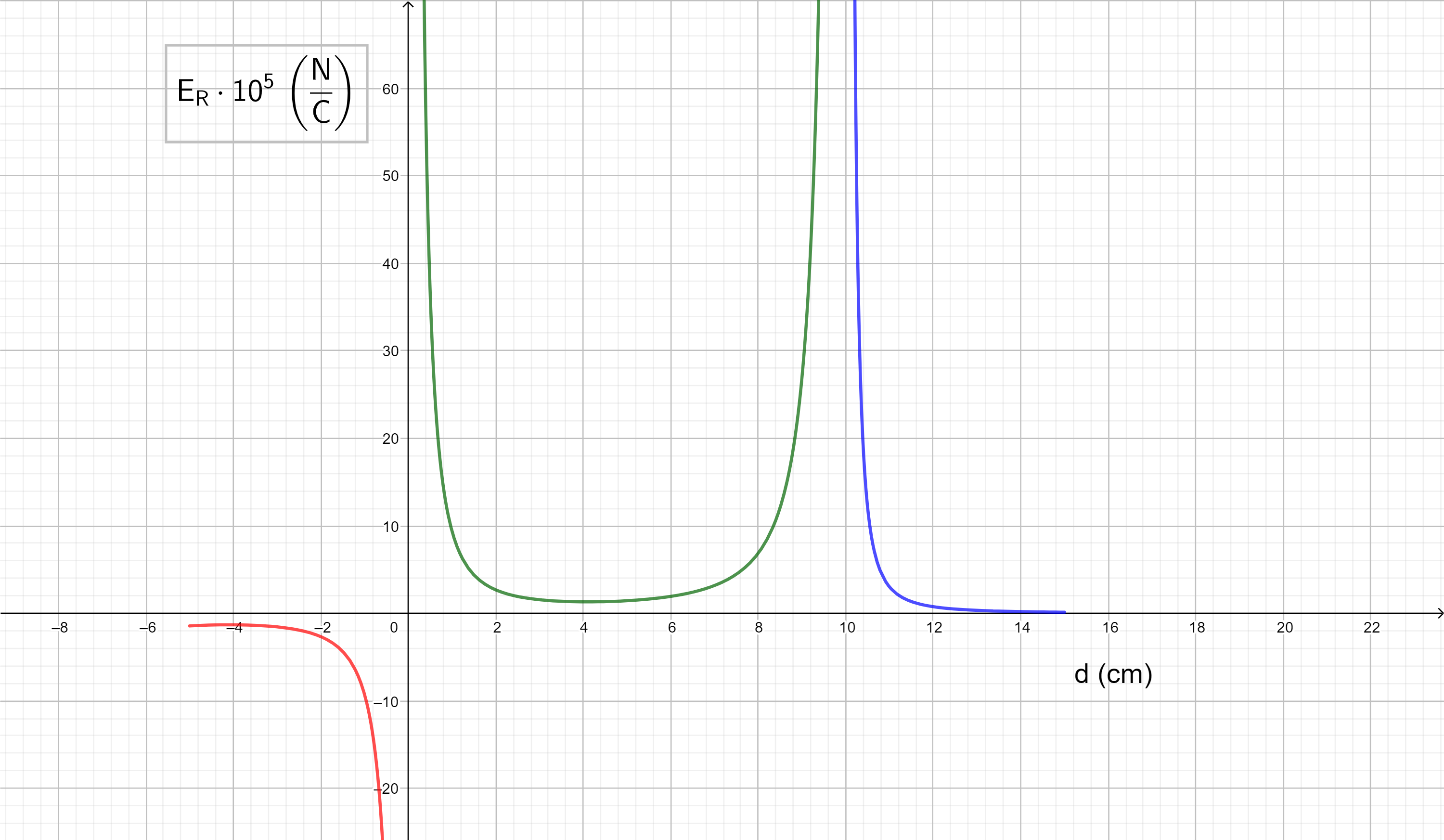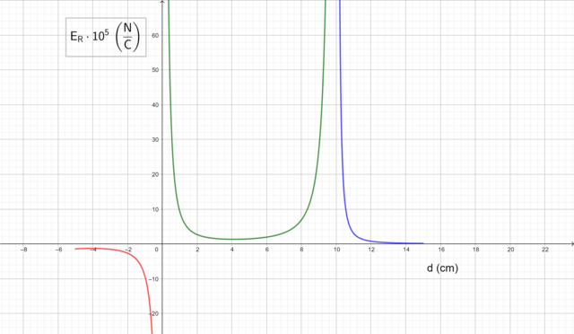 ) entre las cargas, respecto a la distancia que las separa, en un intervalo comprendido entre -5 cm y 15 cm, ambos incluidos. Representa los valores del campo eléctrico en el eje de las Y considerando como positivo el sentido hacia la derecha y negativo hacia la izquierda.