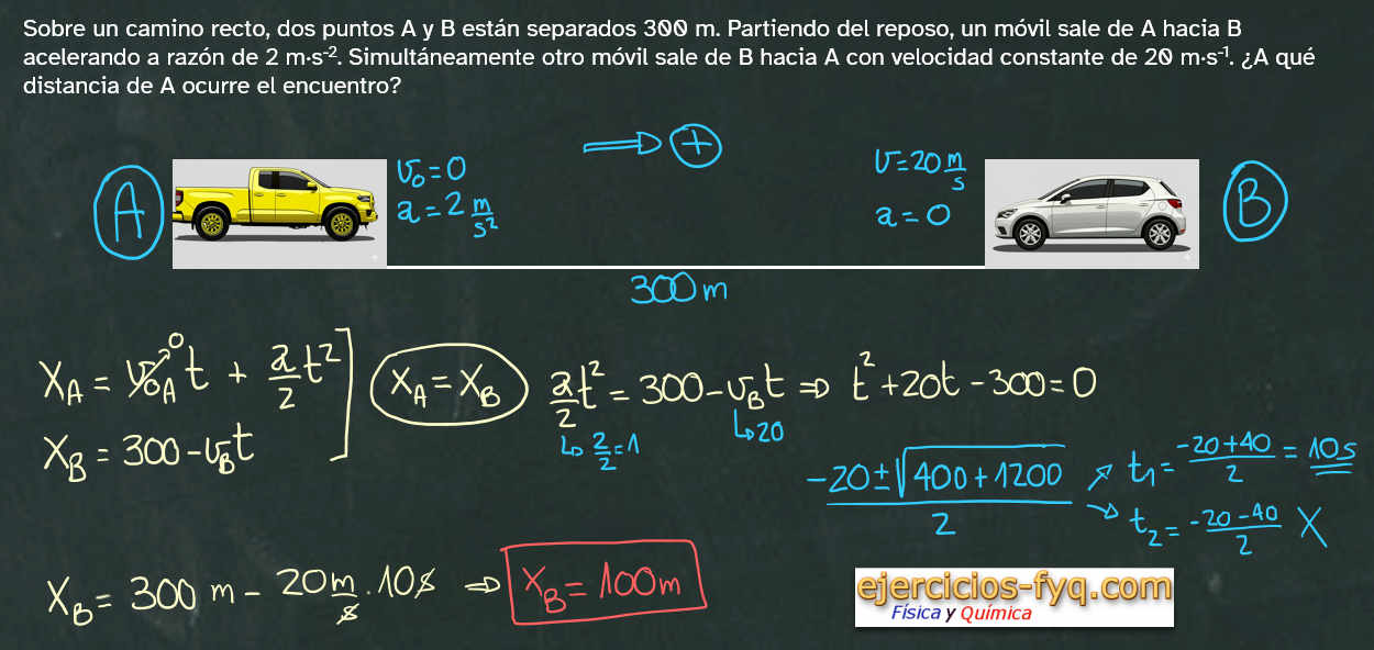 Sobre un camino recto, dos puntos «A» y «B» están separados 300 m. Partiendo del reposo, un móvil sale de «A» hacia «B» acelerando a razón de
