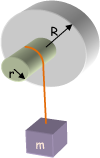 Un disco homogéneo de 2 kg de masa y de radio R = 10 cm gira sin rozamiento alrededor de un eje fijo que pasa por su centro, bajo la acción de un peso de 2 kg colgado de un hilo enrollado en el eje del disco de radio r = 5 cm y masa despreciable, tal y como se indica en la figura. Calcula: