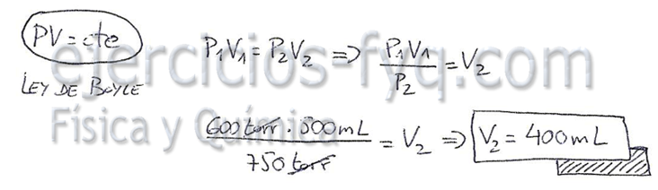 ¿Qué volumen ocuparán 500 mL de un gas a 600 torr de presión si se aumenta la presión hasta 750 torr a temperatura constante?