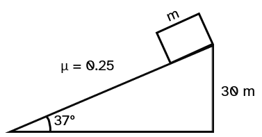 El bloque de la figura tiene una masa de 5 kg. Si se deja libre cuando está en la parte más alta del plano inclinado, ¿cuál será su velocidad al llegar a la parte más baja? Considera que el coeficiente de rozamiento cinético es 0.25 y que la gravedad es $$$ \text{g} = 10\ \text{m}\cdot \text{s}^{-2}$$$
