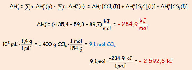 b) ¿Cuál es la energía intercambiada en la reacción anterior, en las mismas condiciones, cuando se forma un litro de tetracloruro de carbono cuya densidad es 1,4 g/mL?