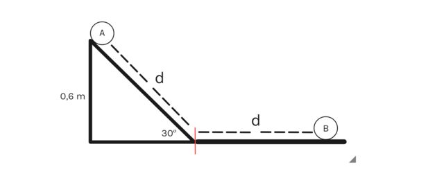 Una esfera de 3 kg de masa rueda por un plano inclinado y luego desliza por un tramo horizontal de igual longitud tal y como indica la figura. ¿Cuál será la velocidad de la esfera en el punto B? Supón que el coeficiente de rozamiento entre la esfera y las superficies es de 0.2.