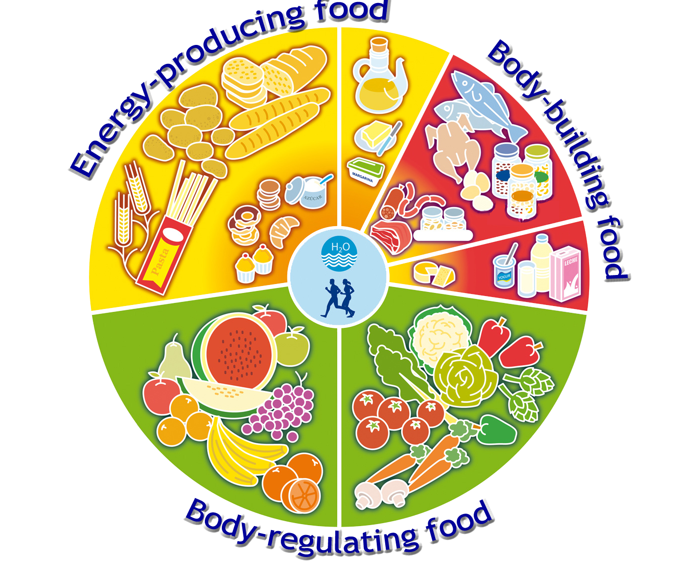 - The colours show the function of each type of food: yellow for energetic function, red for building function and green for regulating function.