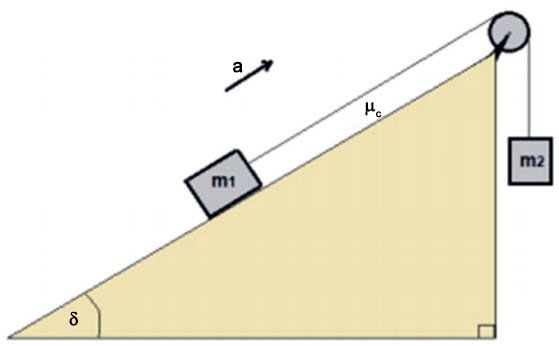 , que se encuentran unidos por una cuerda ideal (sin masa e inextensible) a través de una polea sin fricción de radio R y momento de inercia I. La superficie tiene un coeficiente de roce cinético