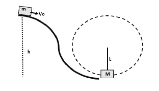 Un carro de montaña rusa de masa m (kg) se mueve sobre un riel sin fricción por la vía que se muestra en la figura. Al pasar por el punto A, la fuerza normal que ejerce la vía sobre el carro es . Cerca de A la vía es circular y de radio L (m). Cuando el carro llega a la parte inferior de la vía lo detiene un amortiguador de resorte con constante de restitución, k (N/m). Calcula la máxima deformación del resorte.