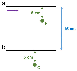 Dos conductores a y b rectos y largos se colocan en forma paralela, tal como indica la figura. Si la intensidad del conductor en el conductor a es de 8.0 A y el campo magnético resultante en el punto P es nulo: