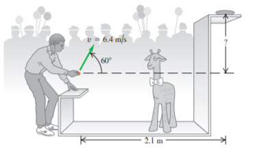 En una feria, se gana una jirafa de peluche lanzando una moneda a un platito, el cual está sobre una repisa más arriba del punto en que la moneda sale de la mano y a una distancia horizontal de 2.1 m desde ese punto (ver figura). Si se lanza la moneda con velocidad de