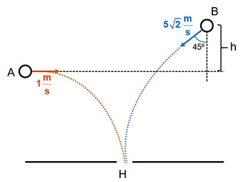 De dos tuberías A y B sale agua como se muestra en la figura. Si los chorros de agua llegan simultáneamente al agujero H (2, -y), calcula la diferencia de altura "h" entre ambas tuberías. (Considera