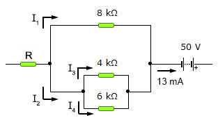 Determina las intensidades de corriente y el valor de la resistencia desconocida en el circuito de la figura: