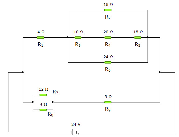 Determina la resistencia equivalente del circuito de la figura y calcula la intensidad de corriente que corresponde a los nodos en los que la batería se conecta a la asociación de resistencias.