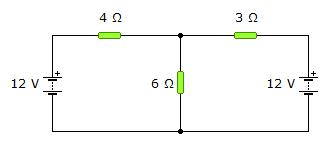 Utilizando las leyes de Kirchhoff, calcula la diferencia de potencial entre los extremos de la resistencia de 6 ![]()