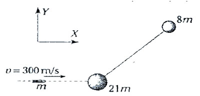 Sobre un plano horizontal y liso se encuentran en reposo dos esferas de igual tamaño, pero masas distintas, unidas por una varilla. Se lanza un proyectil y este se incrusta en la masa más grande, como se ve en la figura: