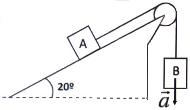 Determina el coeficiente de rozamiento cinético entre las superficies del bloque A y el plano, sabiendo que el bloque B desciende con una aceleración constante de valor