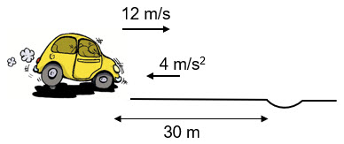 En la figura puedes ver la situación inicial de un coche cuando el conductor se percata del bache y acciona el pedal del freno. Sabiendo que logra deterner el coche a 3 m del bache, ¿cuál fue el tiempo de reacción del conductor?