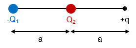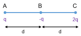 Las esferillas A, B y C tienen las cargas indicadas en la figura y son equidistantes. La fuerza aplicada por A sobre B es de 6.0 N. Calcula el módulo de la fuerza neta que sufre C y dibújala.