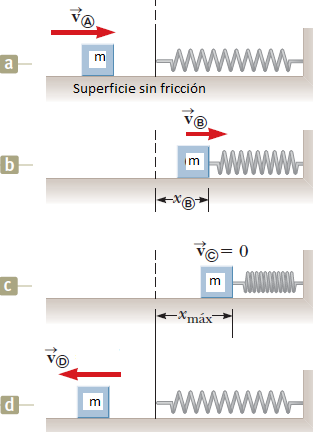 Un bloque de masa 5 kg se desliza, sobre una superficie horizontal sin rozamiento, con una velocidad de 15 m/s en el momento que choca con un resorte, comprimiéndolo y variando su rapidez a 10 m/s. La constante de elasticidad del resorte es de 500 N/m. Calcula, usando consideraciones energéticas, la deformación del resorte.