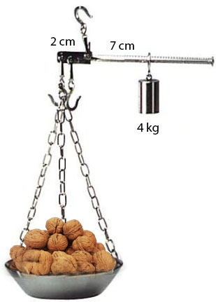 Calcula la masa de las nueces para que la romana de la figura esté en equilibrio: