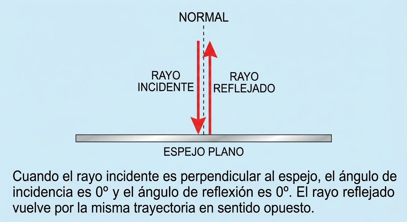 Un rayo de luz incide perpendicularmente sobre un espejo plano. ¿Cuál es la dirección y el sentido del rayo reflejado?