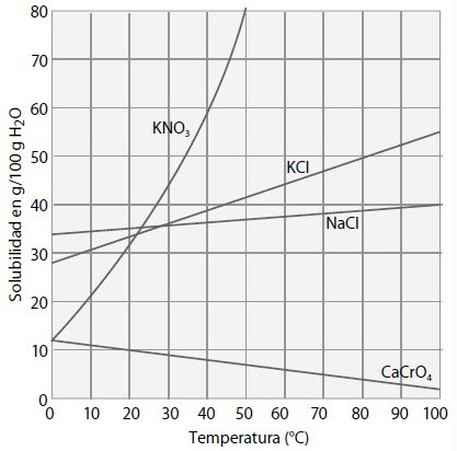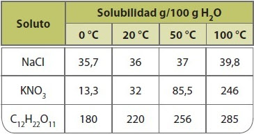 La información de la siguiente tabla corresponde a la solubilidad de diferentes sustancias en el agua de acuerdo con la temperatura: