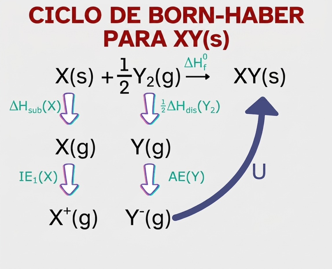 c) Diseña el ciclo de Born-Haber para la formación del sólido cristalino a partir de sus elementos en estado estándar.